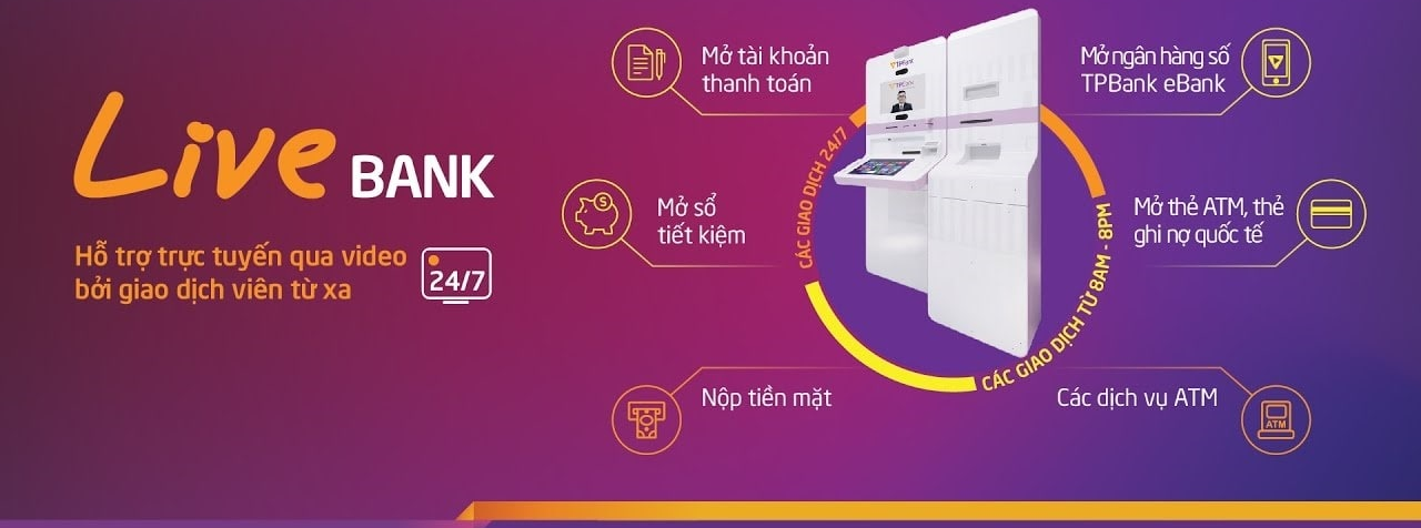 Livebank là một hệ thống ngân hàng thông minh do TPBank phát triển. Đây là hệ thống giao dịch tự động và trực tuyến 24/7 giúp bạn mở tài khoản thanh toán, mở thẻ ghi nợ, mở tài khoản tiết kiệm hay nộp tiền mặt mà không cần đến ngân hàng. Đối với LiveBank, bạn sẽ nhận được thẻ vật lý chỉ sau 5 phút đăng ký thay vì mất nhiều ngày chờ đợi như tại phòng giao dịch. Đó cũng là lý do tại sao khách hàng ngày càng ưa chuộng sử dụng LiveBank.